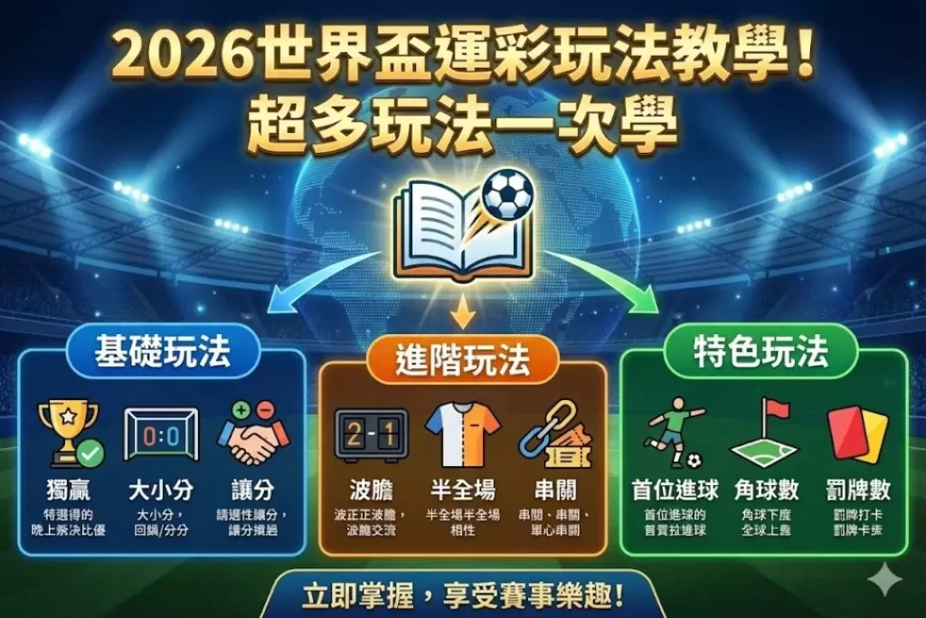 2026世界盃運彩玩法相當多元,從基本的玩法到進階的玩法,通通都有不同的受眾群喜愛,當然在這麼多玩法要選擇自己適合的玩法也相當簡單,你就看你哪種玩法勝率較高,我們就可以鎖定該玩法持續下注,這樣就可以賺進高額獎金,至於2026世界盃運彩玩法有哪些呢?